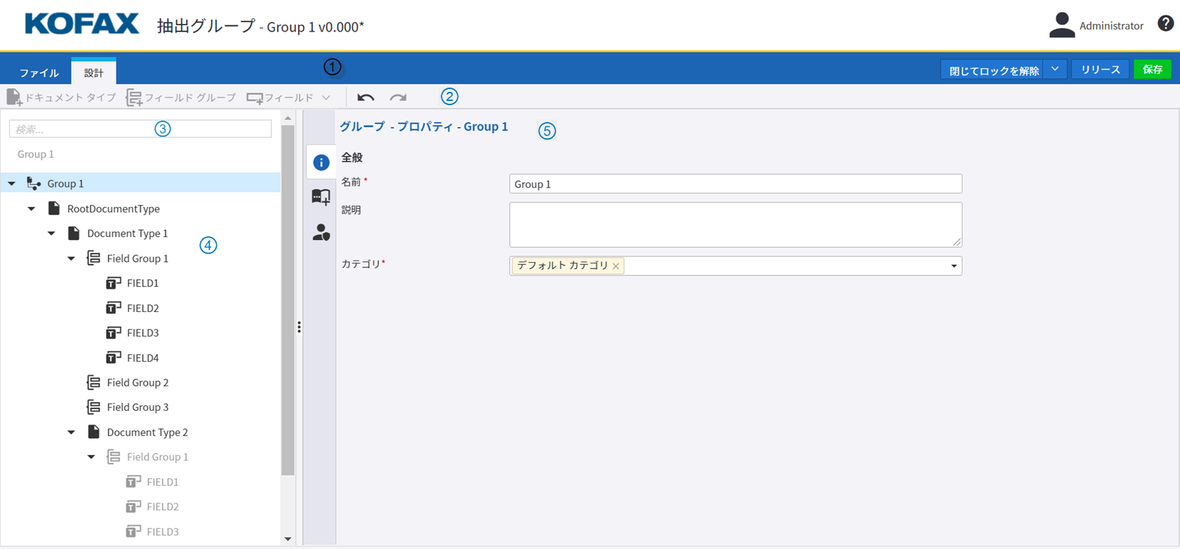 各タブの下にグループ化された抽出グループ、ドキュメント タイプ、フィールド グループのプロパティが表示されます。