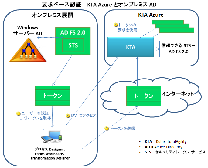 シナリオ 3 このシナリオでは、オンプレミスの Windows サーバー AD FS 2.0 (ID プロバイダとして) を使用してクラウドにインストールした TotalAgility Azure またはオンプレミスについて説明します。