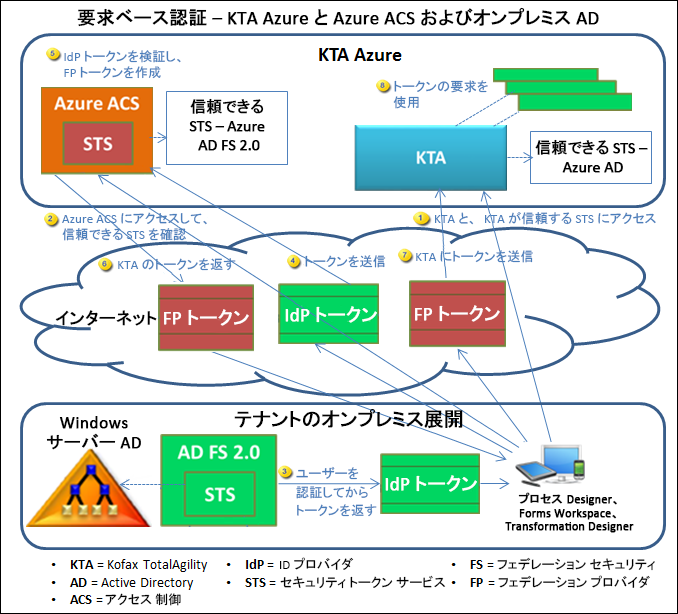 このシナリオでは、Windows Azure AD のアクセス制御 (フェデレーション プロバイダとして) およびオンプレミス Windows サーバー AD FS 2.0 (ID プロバイダとして) を使用した TotalAgility Azure について説明します。