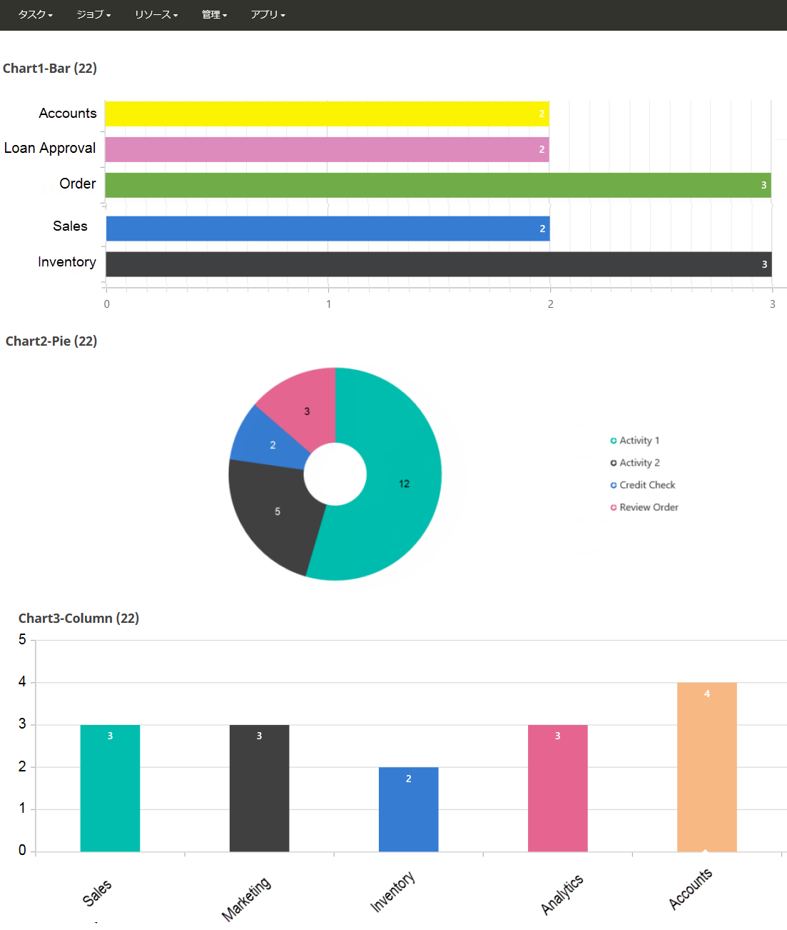 • グラフ 3 - 縦棒グラフ: このグラフは、ライブ ジョブの数とそのアクティビティ プロセスの名前を表しています。ここでは、販売プロセスに 3 個のライブ ジョブがあり、マーケティングには 3 個のライブ ジョブがあります。また、在庫には 2 個のジョブがあり、分析には 3 個のライブ ジョブがあって、アカウントには 4 個のライブ ジョブが関連付けられています。