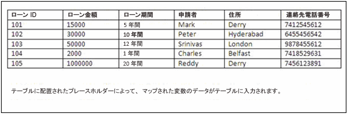 プレースホルダーを使用して、ドキュメント内のテーブルに動的データを入力します。データを入力する行および列に各プレースホルダーを配置します。たとえば、ローン申請テーブルの行 2 列 1 にデータを入力するには、プレースホルダーをそこに配置します。テーブルを参照してください。