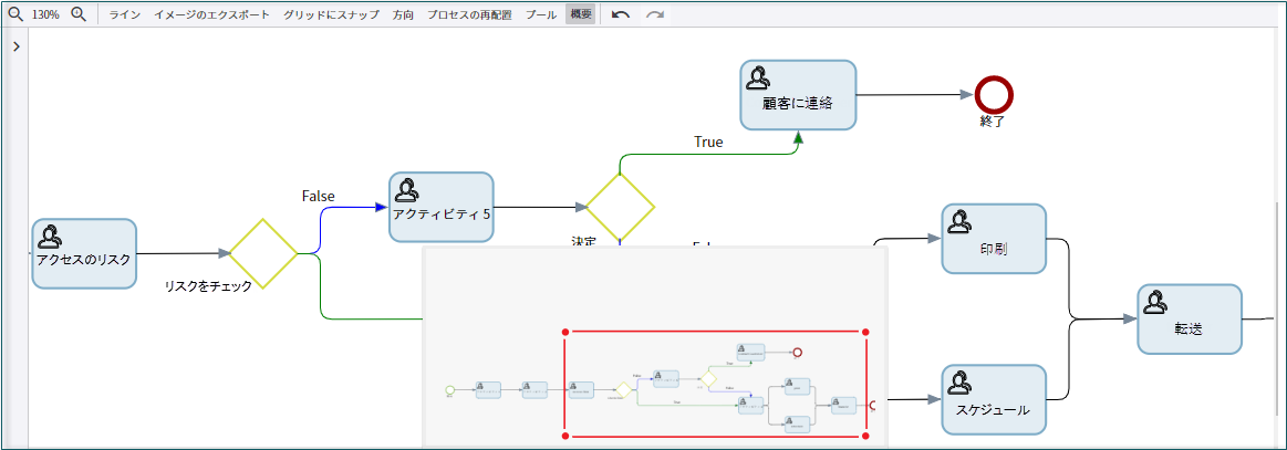 大規模なプロセスの全体をパネルに表示します。また、マウスを使用して特定のアクティビティに移動 (パンまたはズーム) することもできます。[プロセスの概要] パネルについては、次の画像を参照してください。