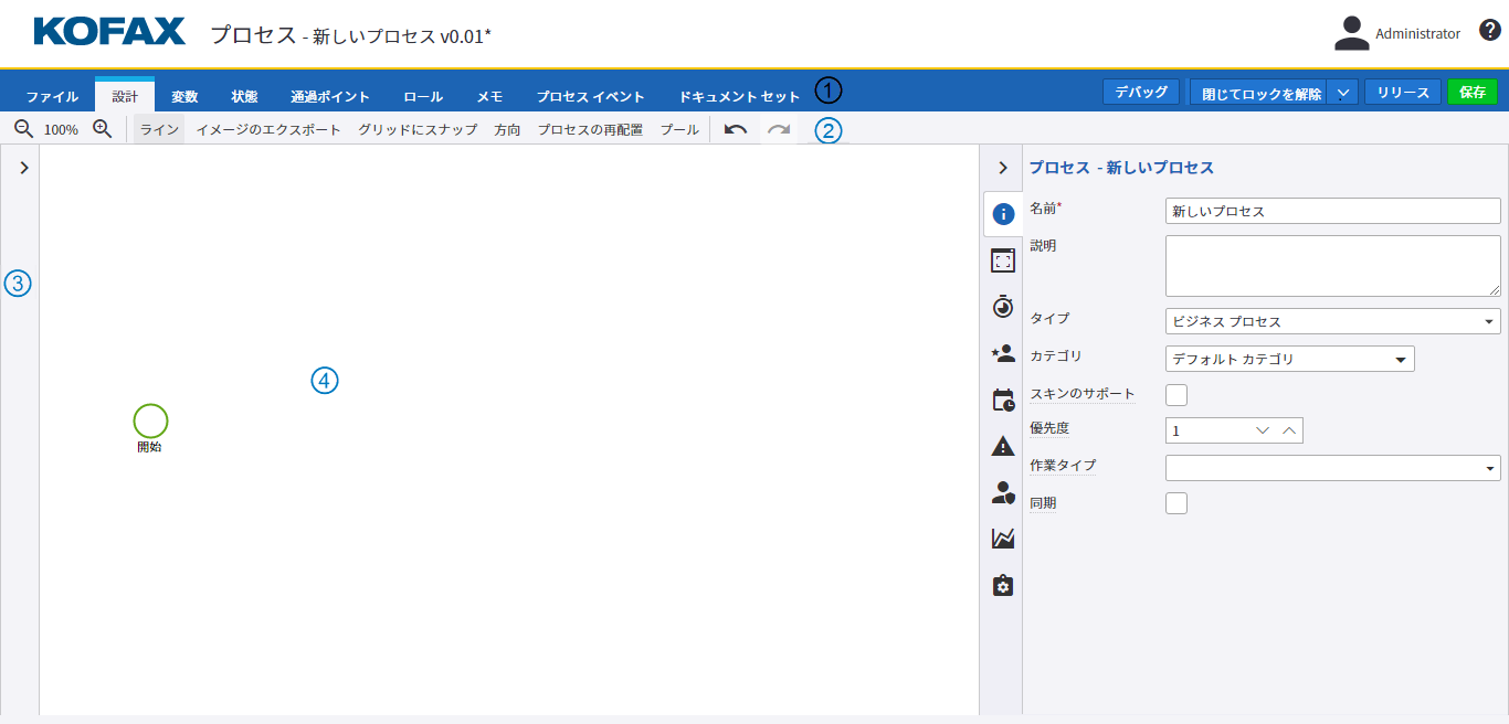 プロセス Designer の中央パネルには、ワークフローを設計するためのキャンバスが表示されます。デフォルトでは、Designer を開くと開始ノードが追加されます。