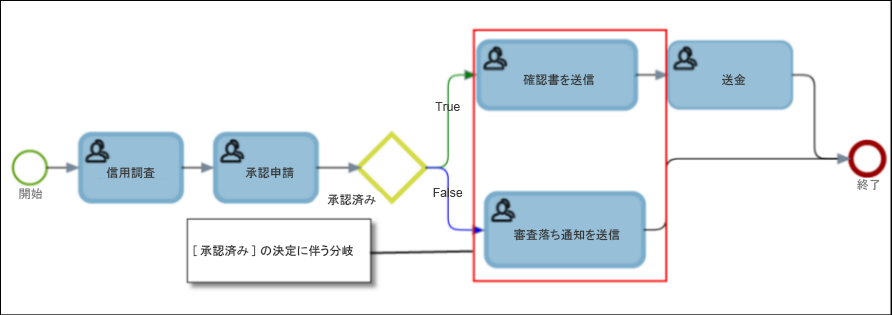 たとえば、ローン承認マップで承認決定を行うときに有効になるパスは、確認文字の送信および審査落ち通知を送信の 2 つです。承認済み条件が true と評価されると、確認文字の送信アクティビティが実行され、その時点で確認文字が顧客に送信され、顧客の貸方勘定に金額が振り込まれます。それ以外の場合は審査落ち通知を送信アクティビティが発生し、その時点でリジェクト文字が顧客に送信されます。