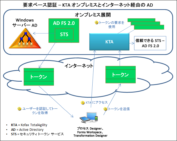 このシナリオでは、インターネット経由でアクセスするローカルの Windows サーバー AD FS 2.0 (ID プロバイダとして) を使用した TotalAgility オンプレミスについて説明します。