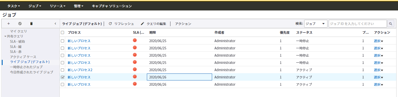 ユーザーは、ジョブ行でアクションを選択することで、単一のジョブでタスクを実行できます。または、テーブル ヘッダーでアクションを選択して、複数のジョブまたはケースで一度にタスクを実行できます。