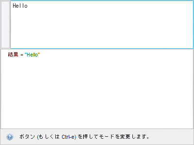- 値モードでは、入力された値は単にテキスト、ブール値、数値などの値として解釈され、評価は行われません。結果パネルに結果が表示されます。表示できる唯一のエラーは、結果タイプが不正な場合です。
