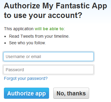 これにより、サービス プロバイダの Web サイトが開きます。Twitter では、以下のように表示されます。