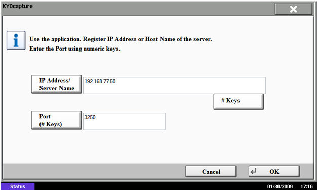 In the configuration screen, enter the IP address and port number for the KYOcapture server.