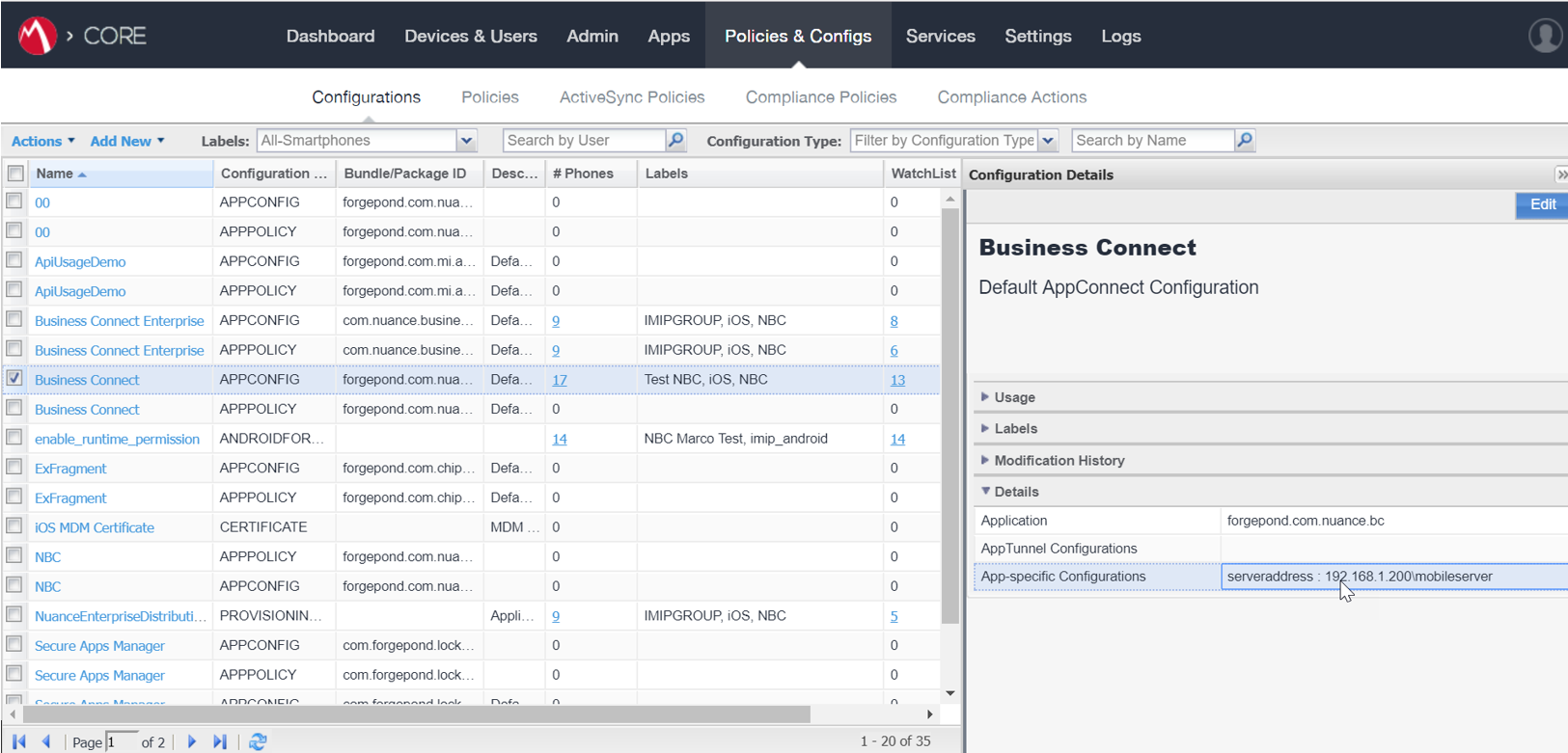 To configure the Mobile Server URL in MobileIron to work with Business Connect, do